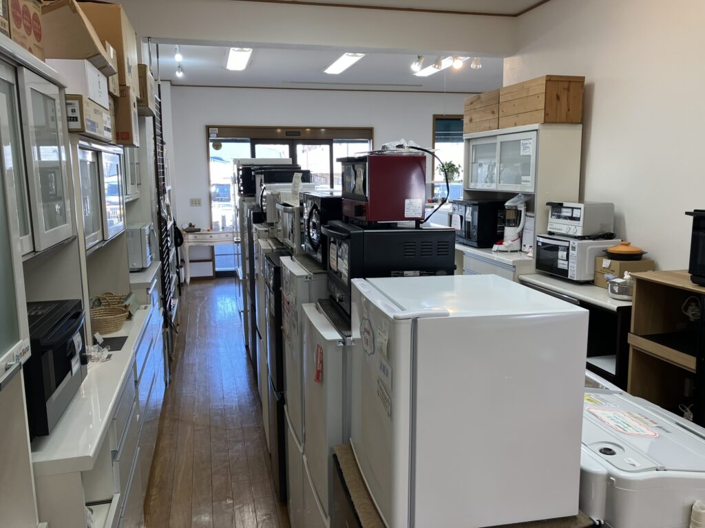一軒家の1階部分が店舗スペースになっており、大型の食器棚や家具家電が整然と並んでいます。メインの品目は家電です。主に、洗濯機や冷蔵庫、キッチン家電で単身者用からファミリー用が販売されています。